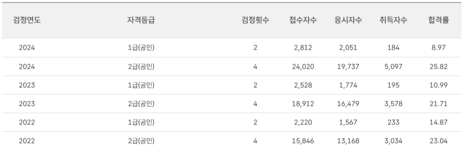 합격률은 1급과 2급이 차이가 있는데 1급의 경우에는 8~15%대로 합격률이 좀 낮은 편이다.