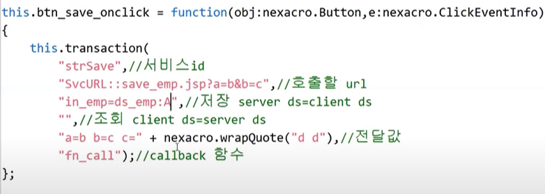 서버와 데이터 통신을 할 때 사용하는 구문이다. 주요 요소로는 service id와 호출할 url, 전달할 data_set과 결과값을 받을 data_set 정도 있다. service_id는 call_back함수에서 분기를 위해 사용된다.