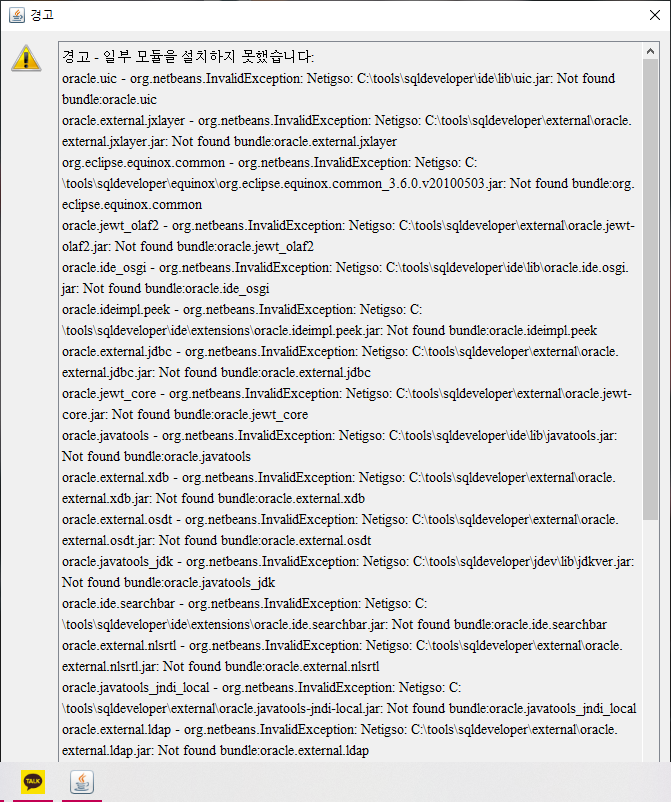 "SQL DEVELOPER 경고 - 일부 모듈을 설치하지 못했습니다." 라는 경고창과 함께 developer 실행이 되지 않았다.